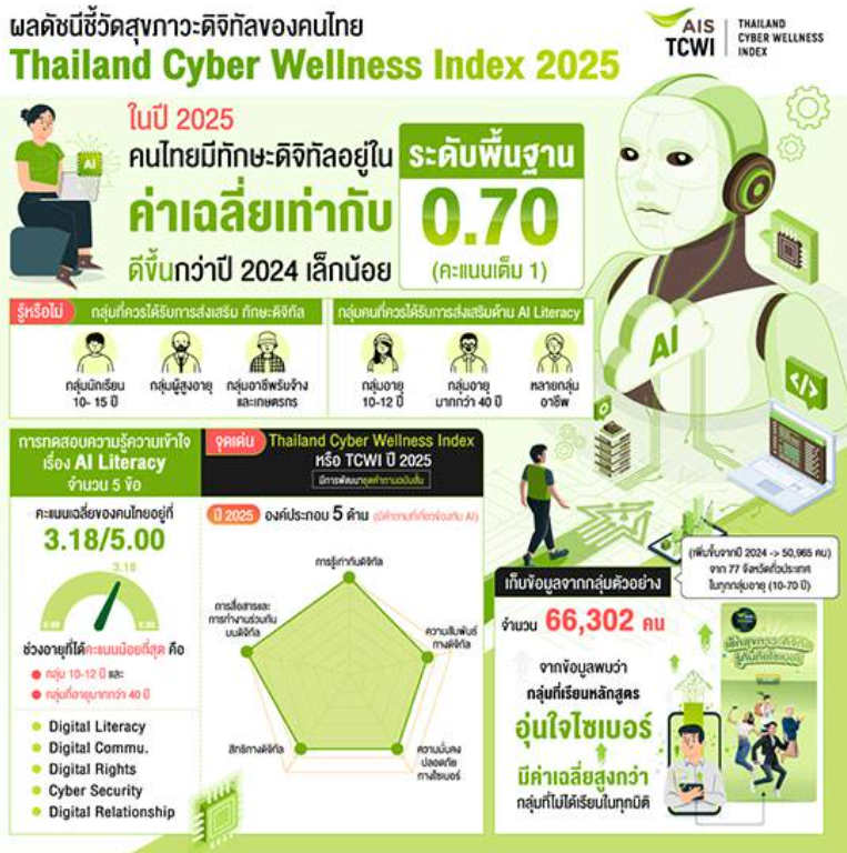 โดยในปีนี้ได้เพิ่มการประเมินด้านความรู้เท่าทันปัญญาประดิษฐ์ (AI Literacy) ซึ่งเป็นทักษะจำเป็นในยุคปัจจุบัน ผลสำรวจพบว่าคะแนนเฉลี่ยของคนไทยอยู่ที่ 3.18 จาก 5.00 ถือว่าอยู่ในระดับกลาง โดยกลุ่มที่มีคะแนนต่ำที่สุดคือเด็กอายุ 1012 ปี และผู้ที่มีอายุมากกว่า 40 ปี แสดงให้เห็นว่าคนไทยยังขาดความเข้าใจเกี่ยวกับเทคโนโลยี AI อย่างเพียงพอและเสี่ยงต่อการใช้งานที่ไม่เหมาะสม